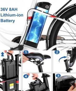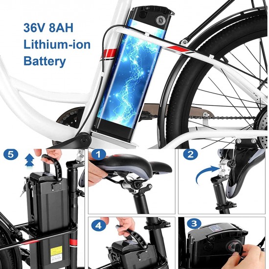 - 【36V 8AH Removable Battery】:electric bike with removable 36v 8ah lithium-ion battery, the battery can be fully charged in 4 to 6 hours. The removable battery design is very suitable for office workers, you can park your bicycle downstairs and take the battery to the office to charge