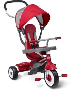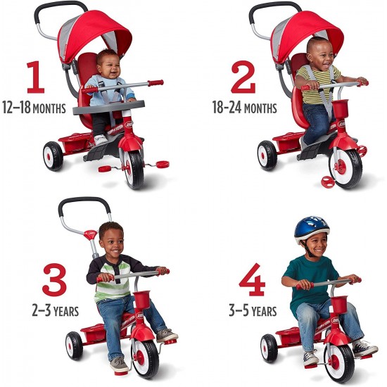 - AGES 1 YEAR TO 5 YEARS: The 4 stages include toddler trike (12 mos. – 18 mos.), steering trike (18 mos. – 24 mos.), learn-to-ride trike (2 – 3 yrs.), and classic trike (4 – 5 yrs.).