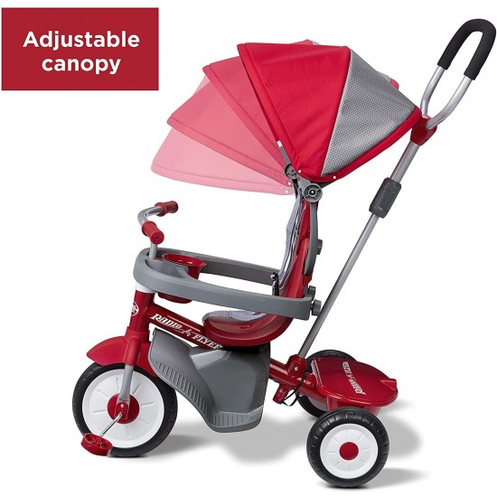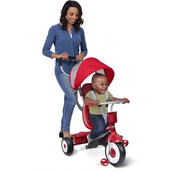 - REMOVABLE ACCESSORIES: The removable accessories allow this tricycle to grow with your child. The accessories include an adjustable UV protection canopy, wrap around tray, headrest and seat belt, foot rest, and parent push handle.