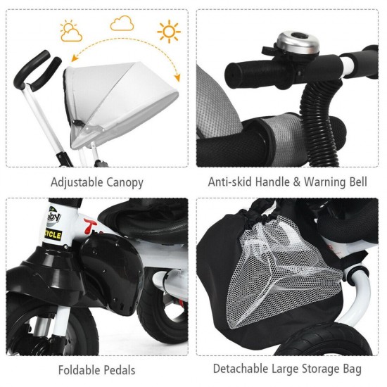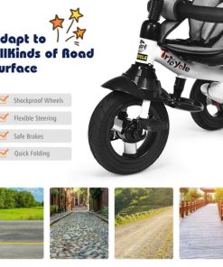 This baby tricycle is perfect for your growing children aged from 1-5 years old and conveniently folds up for easy storage and transportation. It offers 4 ways to ride and easily converts from a stroller to a steering tricycle, learning-to-ride- tricycle, and finally a classic tricycle. This baby tricycle has a parent handle which can be used for steering. And adjustable pedals to prevent baby’s feet from being hit by front wheel. It features many secure s, such as a safety belt to keep your little one safe, a padded handrail which is crash-proof and removable for baby to get on and off easily. It is an ideal present for your kids and they will love to ride this tricycle!Constructed from a iron frame, it has a stable structure and strong load-bearing capacity