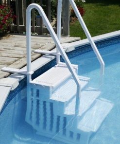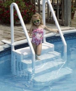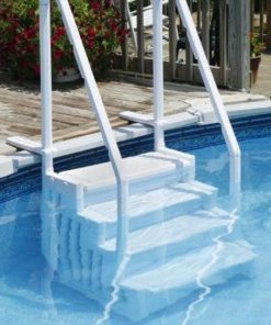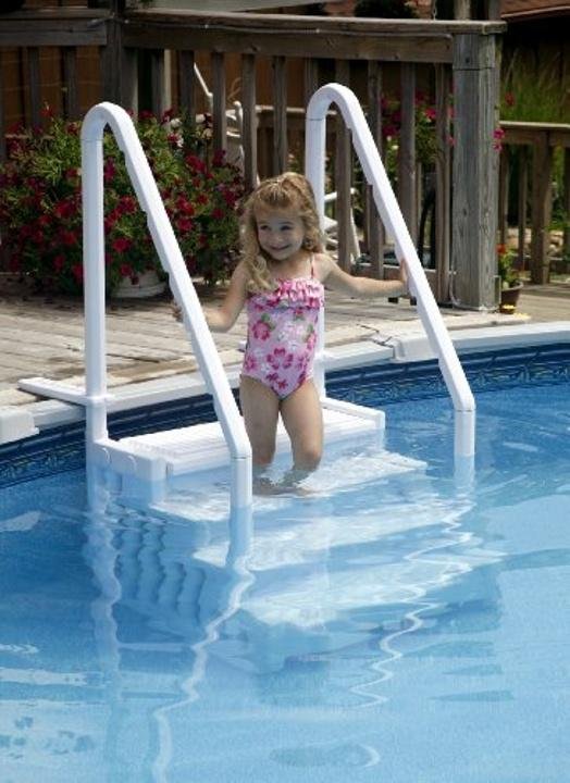 Details: Above Ground Swimming Pool Step to deck Overal Dimensions = 81′ Height, 32′ Depth, 32.5′ Width Step Dimensions = 10′ x 27′ Click here to see the dimensions of the Easy Step Line of Pool Steps If your swimming pool does not have a deck and you need an outside ladder, we sell this above ground swimming pool step with ladder combination. MAKE ENTRY AND EXIT FROM YOUR POOL EASY WITH THIS RUGGED NEW STEP! This rugged step is made from maintenance free polyethylene and it will fit any above-ground pool up to 54 in depth. Double handrails and big slip-resistant steps make an easy exit for young and elderly swimmers alike. The Easy Step is designed to meet or exceed all NSPI standards for safety and swimmer entrapment. The unit is easy to assemble and can accommodate up to a 350-lb. swimmer. The step is perforated to allow water and chemical circulation and eliminate a dead water area where algae can grow. The patented design allows for easy installation and removal of the ballast weight for off-season winterization. Easy Step*s top flanges anchor securely to any deck for a firm footing. Backed by a 3 year manufacturer prorated warranty. Invest in this in-pool step and make entering and leaving your pool a snap – at this great price! Optional 2’x3′ ladder pad goes under the steps and is a great way to protect your liner. Assembly required and you will need about 40 pounds of sand to pour through posts to provide stability.