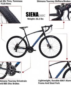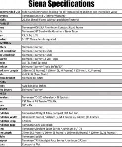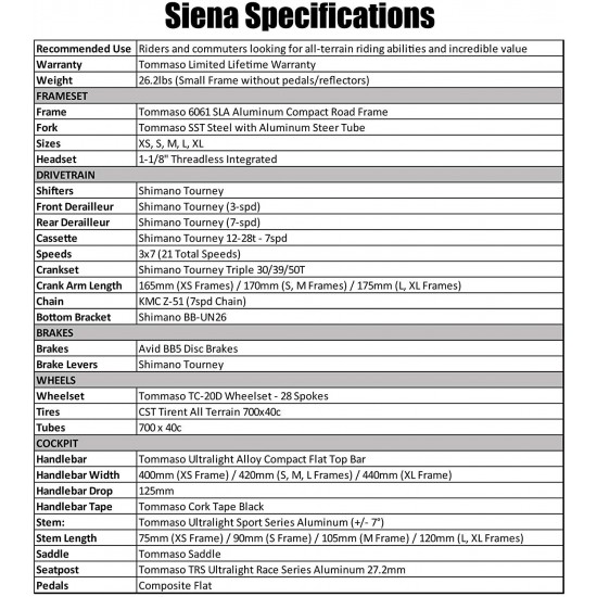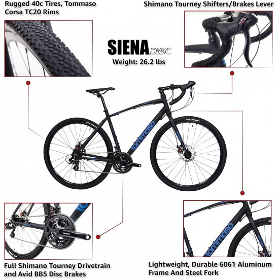 - RUGGED, ALL-TERRAIN CAPABILITIES: We have added wider 700x40c tires for added versatility and stability on rougher terrain. Tommaso TC-20D rims offer the rugged durability of a 28 spoke rim that can handle all types of terrain and keep rolling. The Siena is also equipped with Avid BB5 disc brakes for added stopping power in adverse weather conditions, making this bike perfect for all weather and terrain conditions.