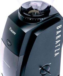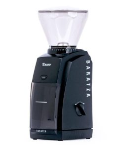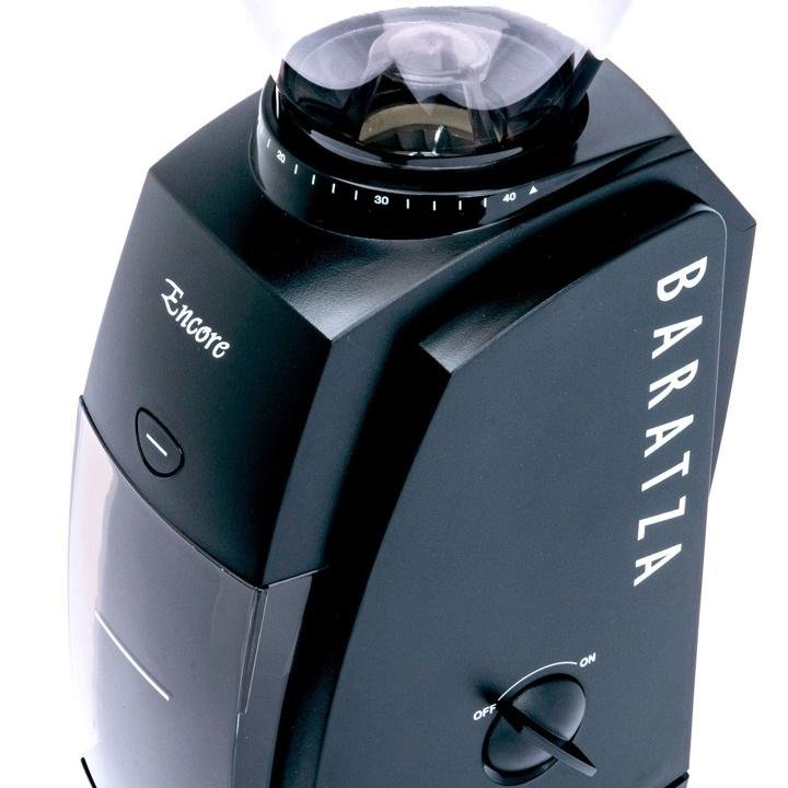 The Baratza Encore is a dedicated home coffee grinder with 40mm conical steel burrs. It has a toggle on/off switch as well as a pulse button, stepped adjustment, and a grounds bin.