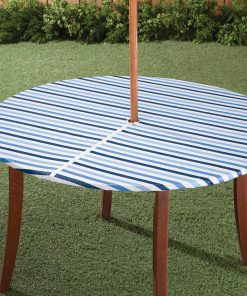 Dressing your umbrella table in blue cabana stripes£¬ this Blue Stripe Vinyl Zippered Elasticized Tablecover by Home-Style Kitchen features an easy on/easy off zipper and elasticized edges for a snug£¬ secure fit when breezes blow. Specially designed with a conveniently placed zipper for easy securing around your table’s umbrella pole£¬ the stylish blue tablecloth is great for parties£¬ barbecues and everyday style. Best of all£¬ the elasticized vinyl tablecover assures spill-proof£¬ moisture-resistant use-wiping clean in seconds. Soft polyester backing protects table surfaces from scratches. 40″-44″ dia. round£¬ 45″-56″ dia. round or 42″ x 68″ oval. Imported.