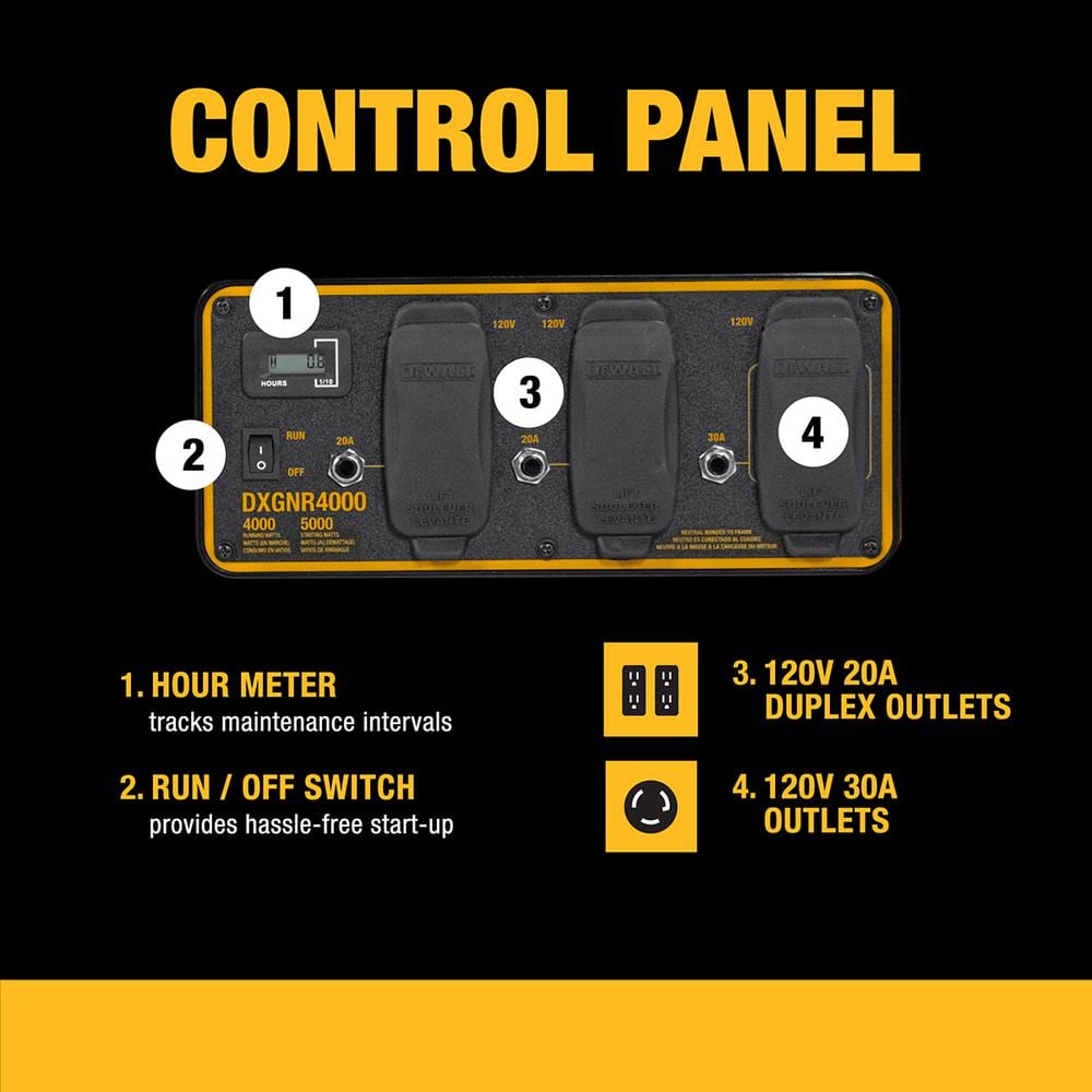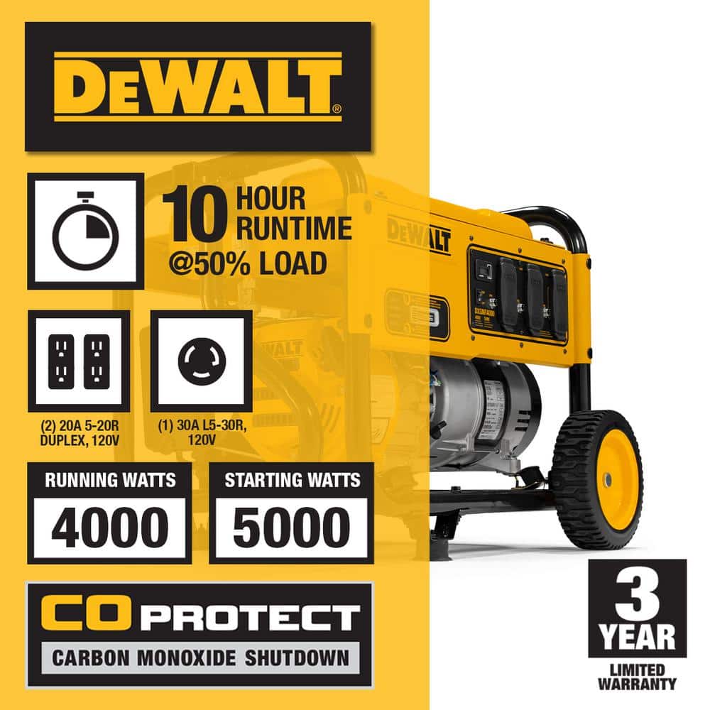 The DXGNR4000 is designed with the professional in mind. The generator is powered by a premium 223 cc engine with low oil shut off which protects the engine from damage. Onboard CO-Protect Technology automatically shuts down the generator if CO levels become unsafe or rapidly increase. This generator is equipped with covered outlets to protect from elements and features never-flat wheels for maximum portability and durability. The 3.4 Gal. steel fuel tank provides up to 10-hours of runtime at 50% load. The Hardened 1 steel tube frame is job site tested for superior durability and strength. The DXGNR4000 Portable Gas Generator Guaranteed Tough.