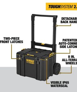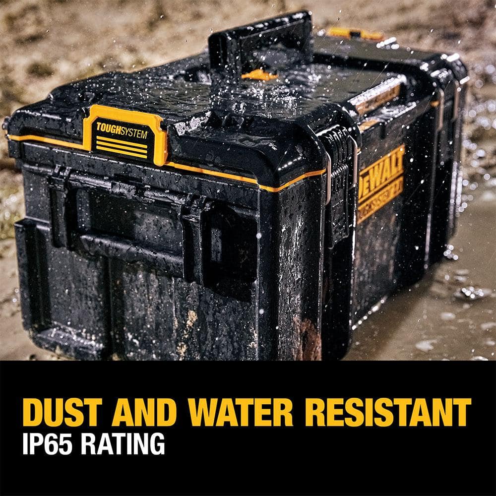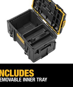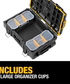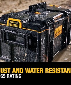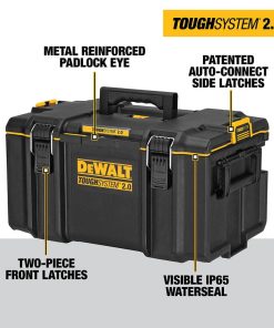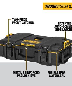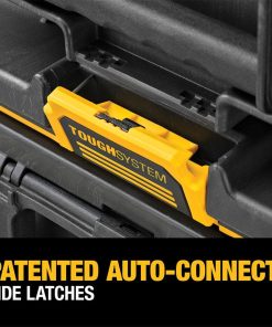 The TOUGHSYSTEM 2.0 Tool Box has patented auto-connect side latches£¬ allowing for 1 hand operation. It also has 2-piece metal wire front latches for added durability when securing tools inside of the box. This tool box offers 20% more tool storage when used with DWST08300 and DWST08450 as part of a tower. It is IP65 rated for dust and water resistance and has a 110 lbs. load capacity. The tool box contains 2 large organizer cups on the inside with removable dividers for optimal organization. The TOUGHSYSTEM 2.0 Tool Box is compatible with all TOUGHSYSTEM products. For a limited time get a bonus 22 in. Medium Tool Box and 24 in. Mobile Tool Box with purchase.
