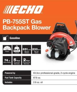 The professional-grade ECHO PB-755ST gas leaf blower combines powerful performance with ease of use. The easy to reach tube mounted throttle has cruise control for operator convenience while using this lawn blower. Packed with features, this gas blower is professionally designed for durability and ease of maintenance.
