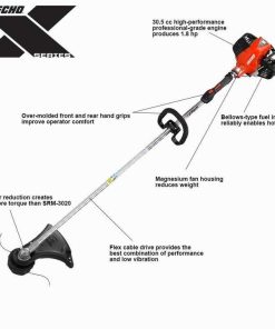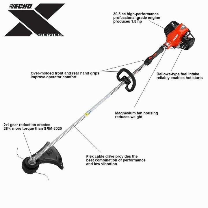 ECHO*s X Series SRM-3020T high torque trimmer offers leading engine and cutting performance. With a 20 in. cutting swath, productivity especially when cutting through thick grass and weeds. The flex cable drive gives operators the best combination of performance and low vibration.