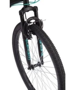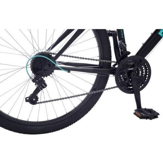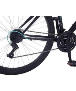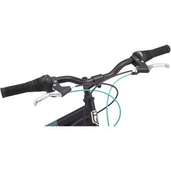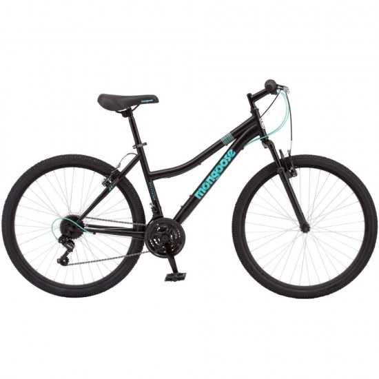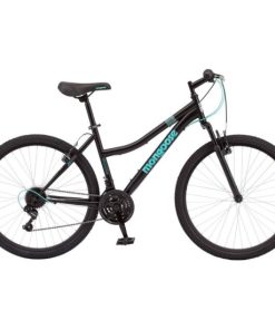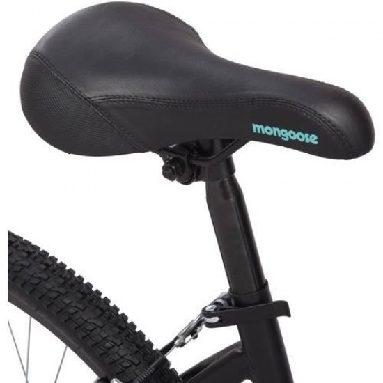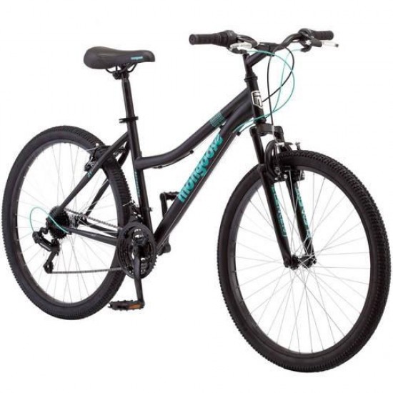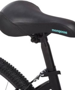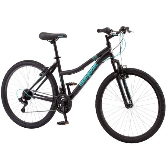 Take on steep slopes and tough courses with g on the 26″ Mongoose Excursion Lady Mountain Bike. It features a sk, all-black that looks classy and red. This mountain bike is built with a durable steel mountain frame that’s ed to take the abuse of bumps and dips found on dirt pathways and trail roads. It comes with 21-speed twist shifters that offer complete control over resistance and speed while traveling, letting you fine tune your ride as you go. The Mongoose mountain bike benefits from a reliable Shimano rear derailleur that offers smooth performance as you change from one gear to the next. Slowing down to a halt, even on a steep hill, is simple, thanks to the front and rear linear pull brakes. This bike comes equipped with solid alloy rims that help lighten the load a bit and knobby tires that will dig into dirt, sand or grass effectively during your rides.