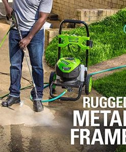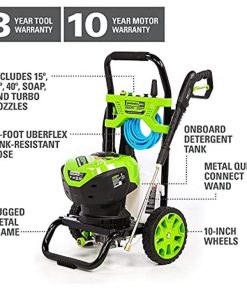 Details: The Greenworks 2200 PSI pressure washer features a powerful brushless motor, 2. 3 GPM, metal quick connect wand, (15~, 25~, 40~, soap, and turbo nozzles), Tangle-Free hose, Onboard detergent tank, 8′ wheels, 3-year