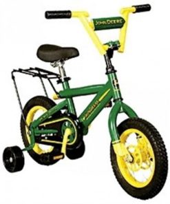 Built like a Deere! The John Deere 12 inch bike features a heavy duty frame, adjustable, removable training wheels, a rear carry rack and an adjustable seat. Instructions are provided for easy assembly. Suitable for children 3 years old and up and a weight limit of 75 pounds. A 90 day warranty against defects is included; any questions can be directed to TOMY Customer Service at 800-704-8697.? Heavy-duty frame ? Carry rack and adjustable training wheels ? John Deere licensed product ? Weight limit 75lbs. ? Suitable for ages 3 years and up