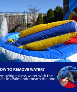 - BUILT-IN WATER & DRAIN SYSTEM: Turn your backyard into a fun water park in minutes with the easy-to-connect water system by simply connecting any home garden hose to the built-in water tube. The inflated splash pool comes with a built-in drain underneath to help remove excess water.
