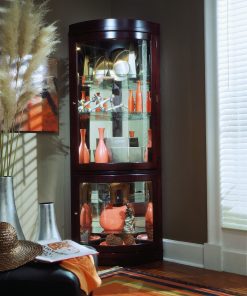 This understated and sleek curio will be an inspiration. Try putting a pair in the corners of a dining room for symmetry and high impact. Or place one in a teenagers room to corral their mementos. This round-front modern curios built in select hardwood solids and veneers with a deep Chocolate Cherry finish. It features two doors£¬ a mirrored back£¬ halogen lighting£¬ adjustable glass shelves£¬ and adjustable glides for leveling. Our curio can display a lot in just 23 inches of wall space.