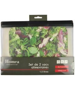 Set of 2 pieces of resable food bagsCapacity 1.5 Litres per bagSuitable for food, fridgde zerWith a hermetic seal top
