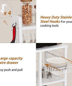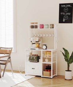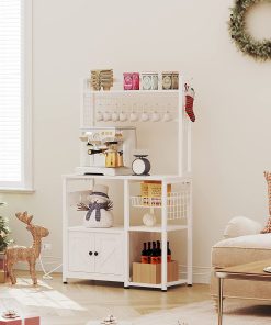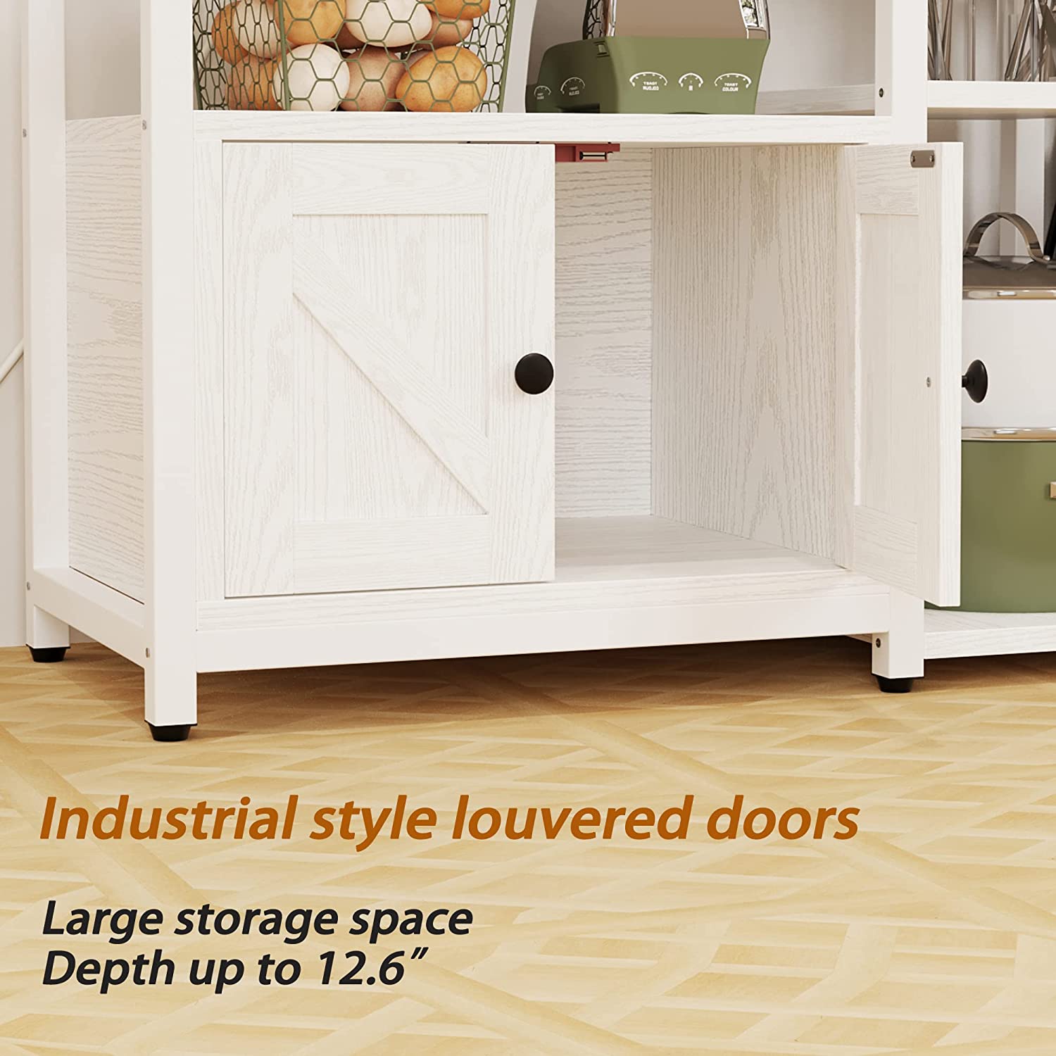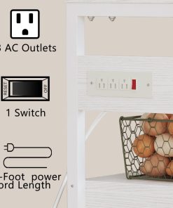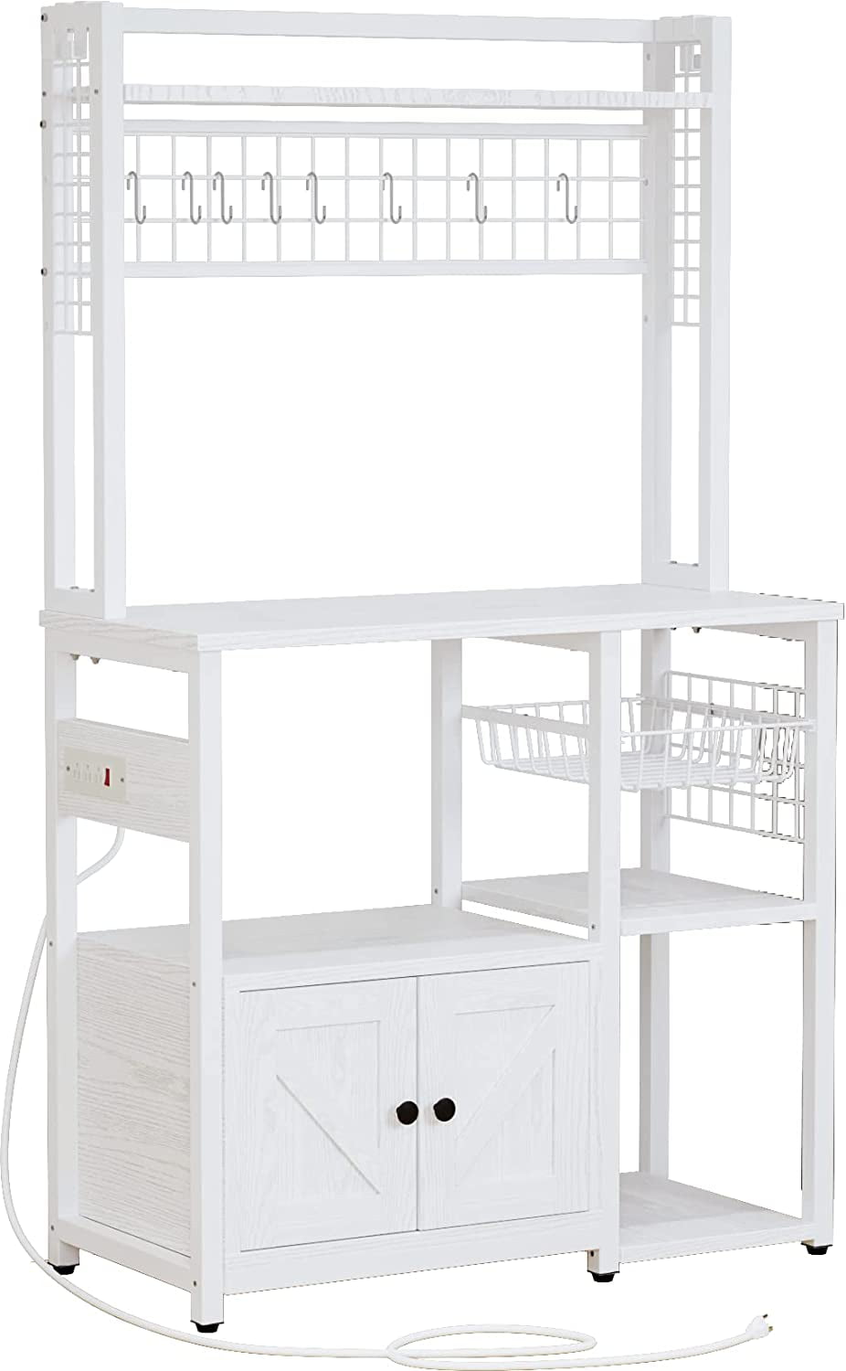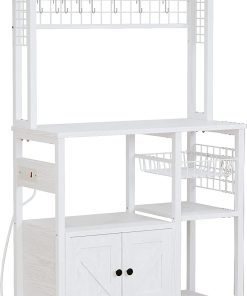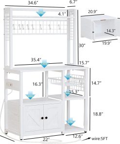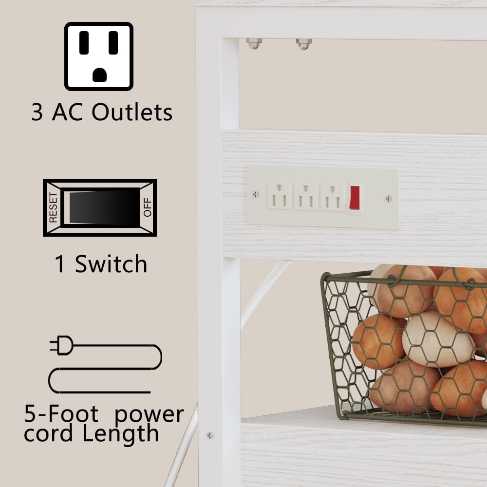IRONCK Bakers Rack with Power Outlets, Microwave Stand Kitchen Shelf with Cabinet for Kitchen, Industrial White,Wood and Metal