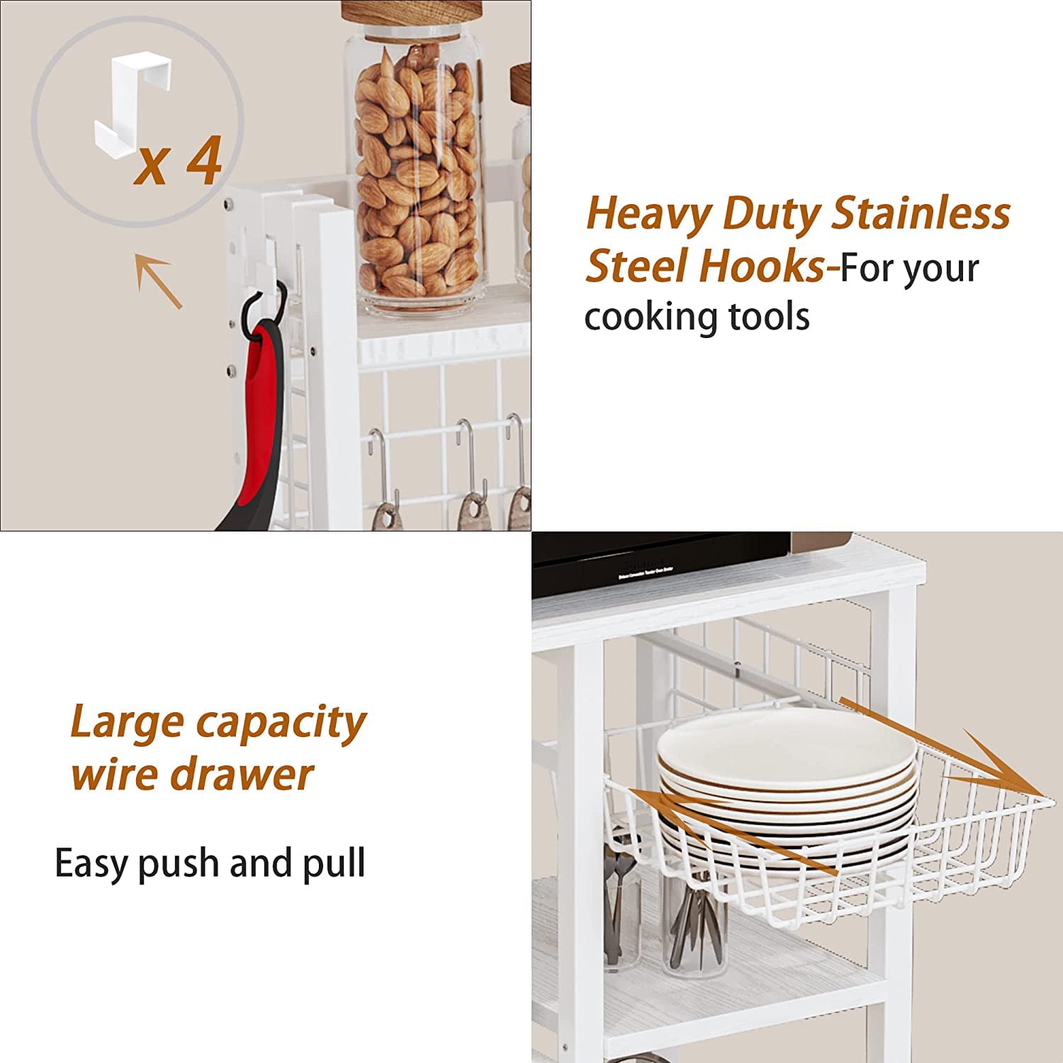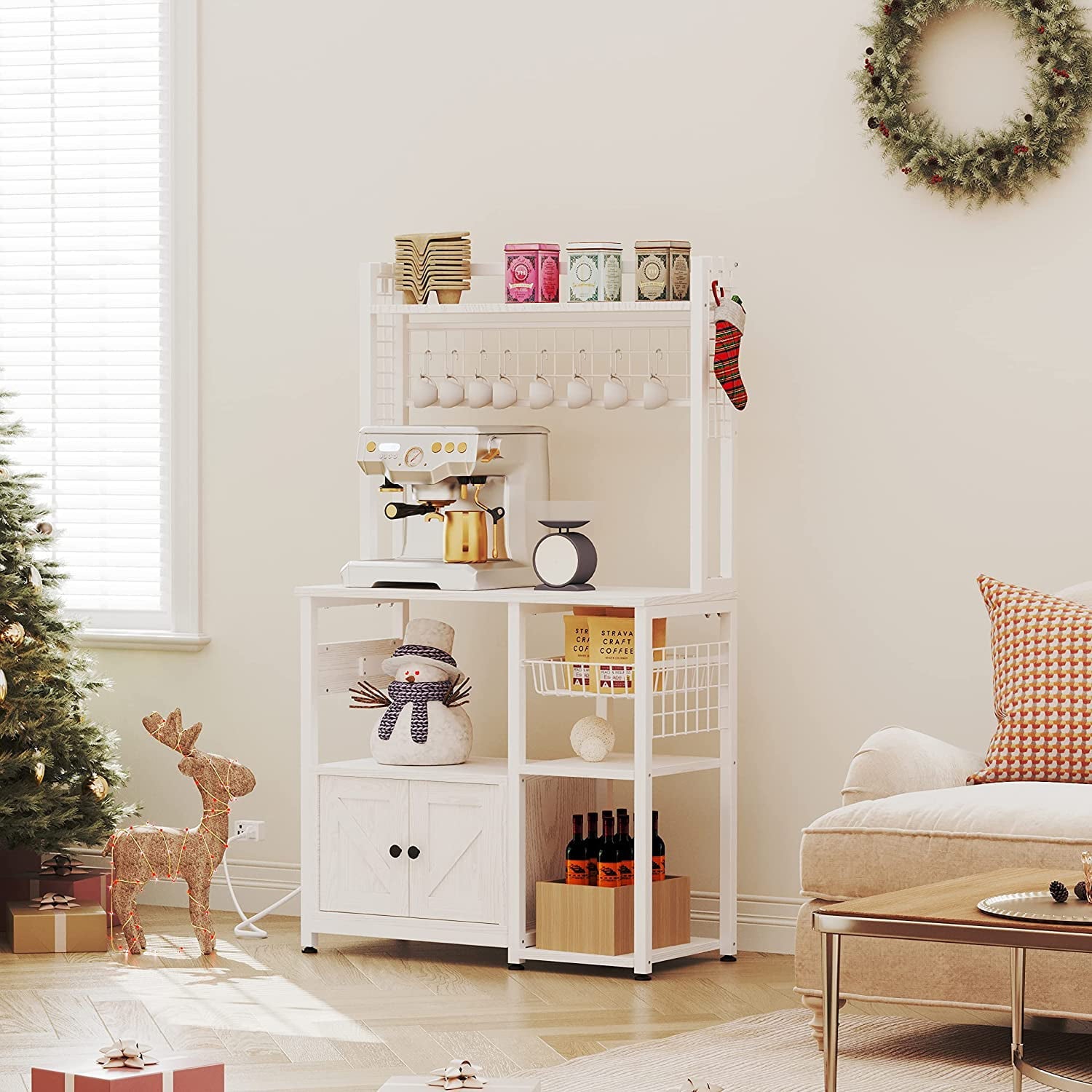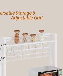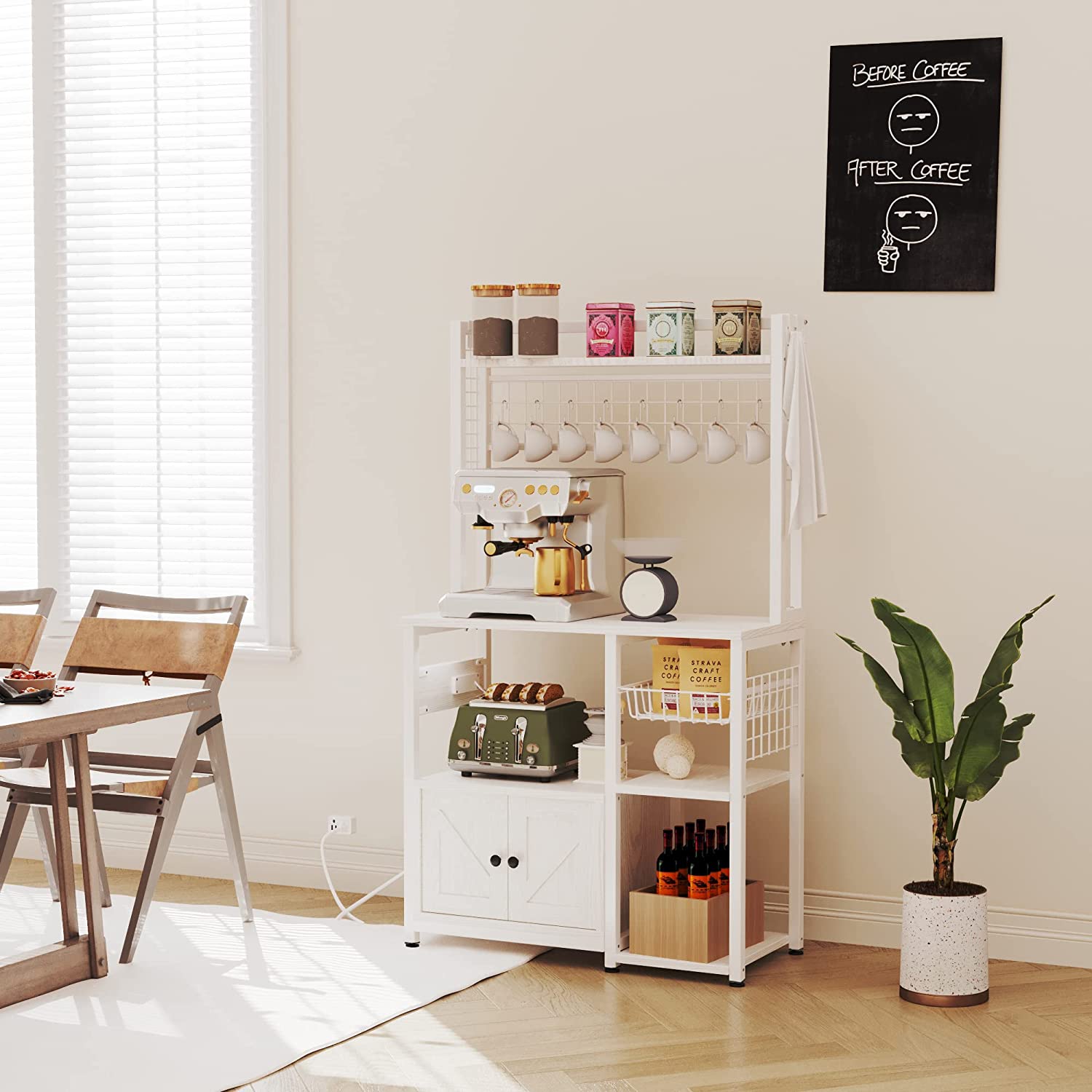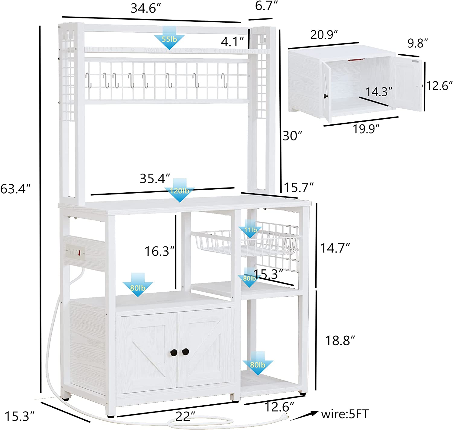 IRONCK Bakers Rack with Power Outlets, Microwave Stand Kitchen Shelf with Cabinet for Kitchen, Industrial White,Wood and Metal