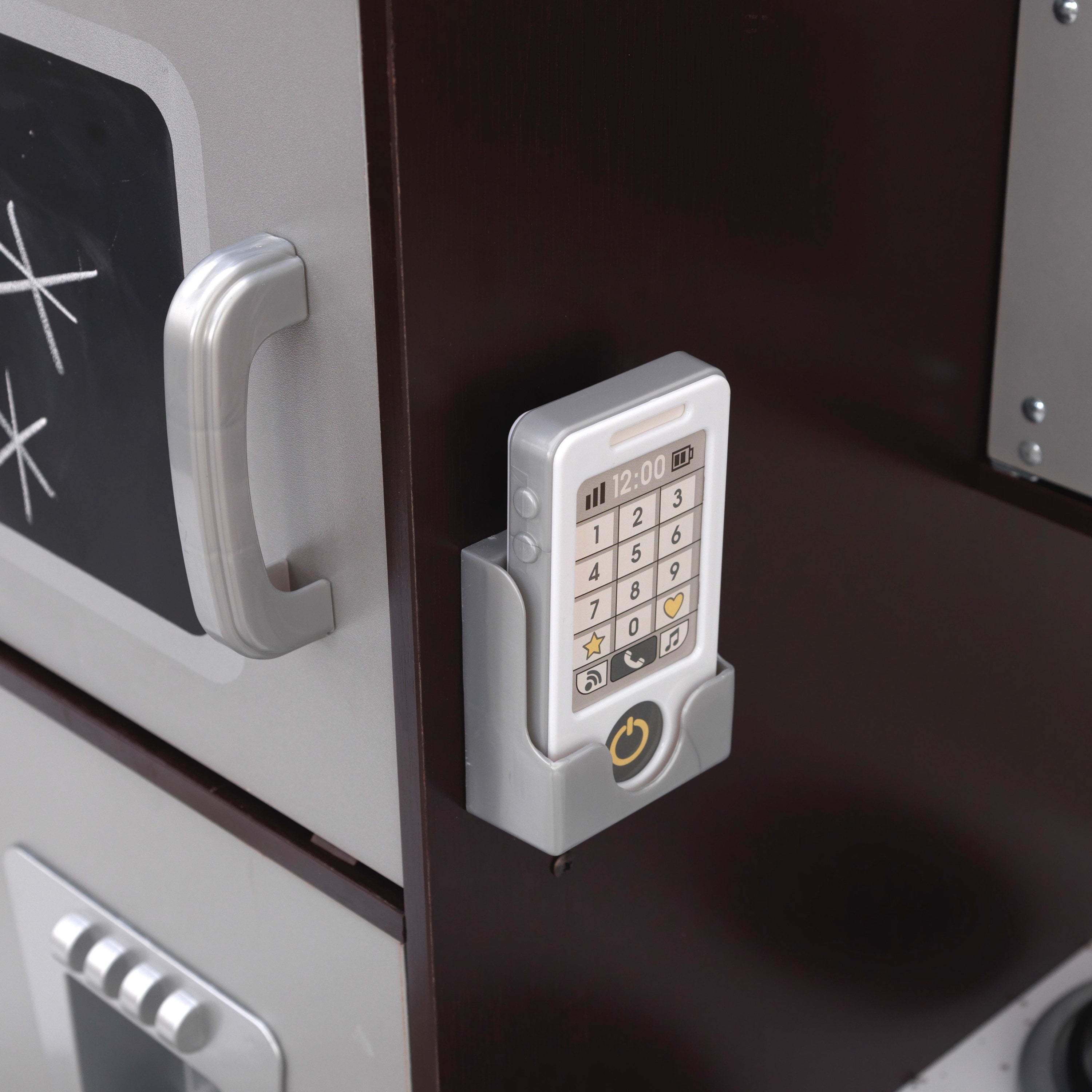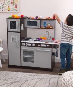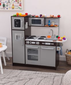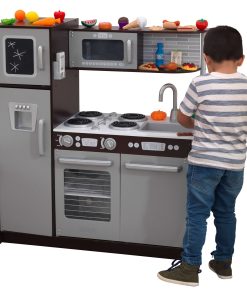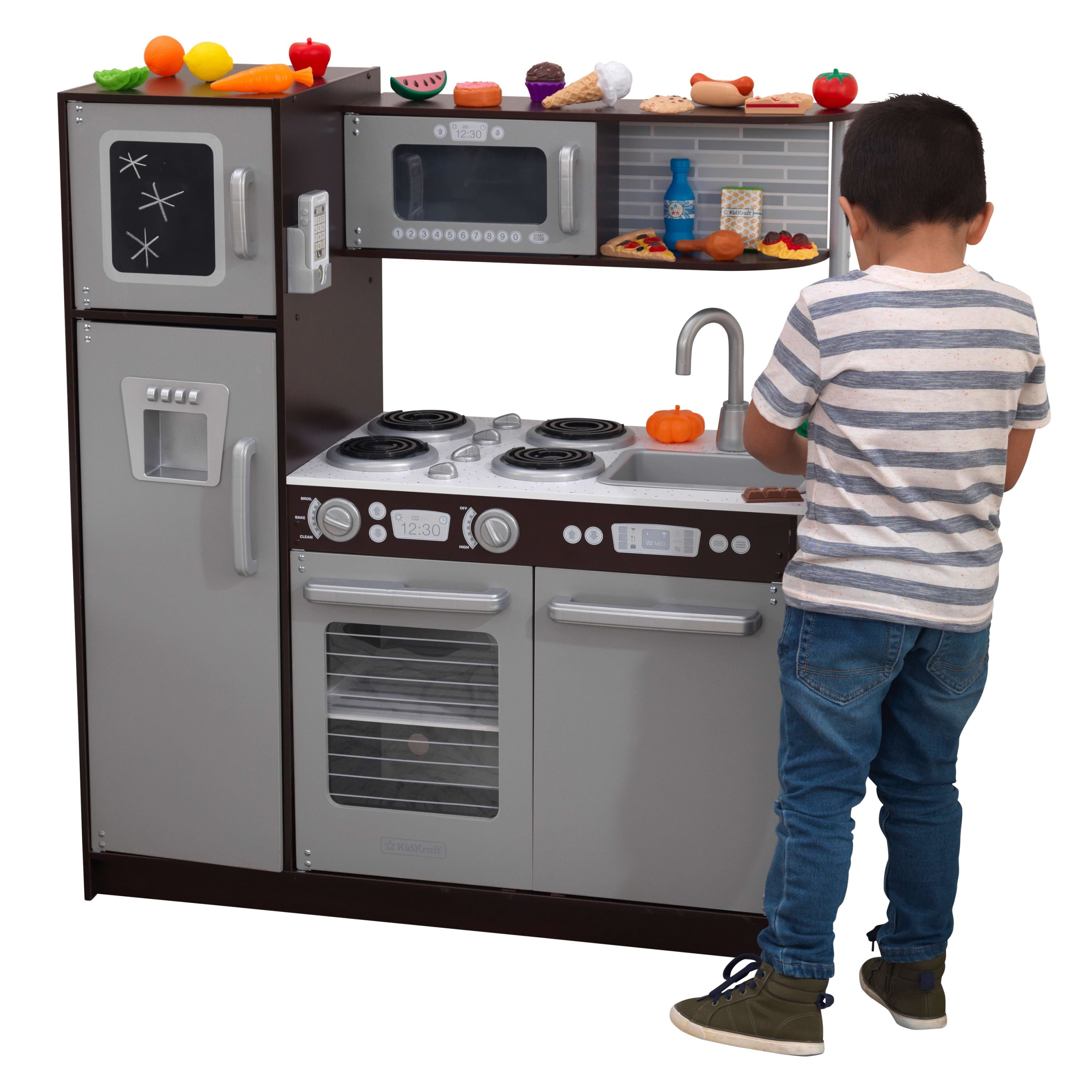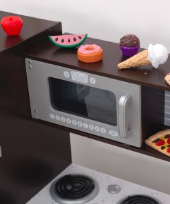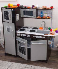 This is KidKraftFTs award-winning Uptown Espresso Kitchen with a 30-piece play food set already included. Interactive features like clicking and turning knobs£¬ appliance doors that open and close£¬ realistic stove top burners£¬ working chalkboard and more£¬ kids can discover and explore their culinary side. Crafted from sturdy composite wood£¬ the kitchenFTs motif simulates the dark wood and stainless steel design found in modern kitchens. Who knows what culinary creations this kitchen will inspire in your little foodie!