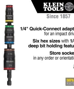 Multi-purpose Impact Flip Socket features six of the most commonly used hex driver sizes stored on one easy to use blade. Three interchangeable sockets store on the driver shaft to avoid any loose pieces that can get lost. The tool is impact rated for use with any impact driver. A powerful rare earth magnet allows the sockets to hold onto any fasteners. The sockets are color coded for easy identification. Use with either an impact driver or on a Klein screwdriver handle (Cat. Nos. 32900£¬ 32303£¬ 32304 or 32308). Includes six hex sizes with 1/4-Inch deep bit holding feature. 1/4-Inch Quick-Connect adapter for an impact driver. Sockets store on shaft in any order or orientation. Detachable sockets allow for easy removal of metal shavings from magnet. Sockets store on shaft in any order or orientation. Patent pending design. For more than 160 years£¬ Klein Tools has manufactured premium-quality£¬ professional-grade hand tools that deliver the performance£¬ durability and precision needed to get the job done right. Our family of engineers£¬ workers and craftsman continue to put six generations of expertise into every tool we create by using only the highest quality materials£¬ superior workmanship£¬ and keeping manufacturing as close to home as we can. Klein isnFTt just the name of our company£¬ itFTs also our family name. And since weFTre an American company thatFTs family-owned and family-run£¬ you know you can count on us to be here tomorrow. Klein Tools doesnFTt just make great products£¬ we make great products that stand up to the demands of the professionals who use them every day � Since 1857.