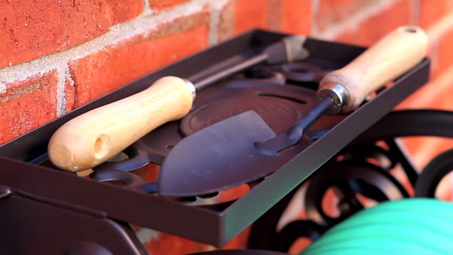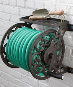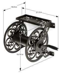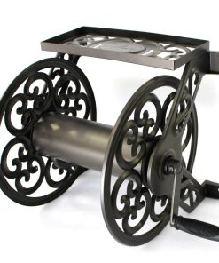 The Liberty Garden model 708 winds and stores your garden hose in style. The sturdy powder coated steel frame has spiraled flourishes and brass fittings. Holds up to 125-foot of 5/8″ garden hose. Convenient top storage tray holds garden necessities. Arrives fully assembled£¬ just attach the handle! Mounting hardware not included.
