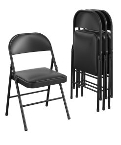 Enhance your next birthday party£¬ holiday gathering£¬ or wedding with the Mainstays vinyl padded seat and metal back folding chair! The black color of this product allows you to have a simple£¬ elegant addition to your living space without clashing with your existing color palette or furniture layout while providing extra seating for special occasions or daily use. Constructed out of a vinyl seat and steel frame combination£¬ this chair to be a long-term purchase you can use with peace of mind and no regrets! The vinyl material provides you with an easily maintained product that can withstand all kinds of messes and never fold under the pressure. The black steel legs make our chair heavy duty while retaining its stylish simplicity. Featured with this are non-marring leg tips intended to prevent slipping when in use and protect your floor’s surface from any possible damage. When not in use£¬ the fold hinges built into the chair allow this product to fold flat for easy£¬ non-invasive storage so itFTs out of sight£¬ out of mind! Pair this chair with our folding tables and make your next gathering an entertainer’s dream!