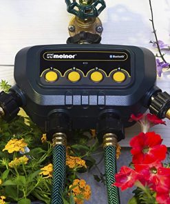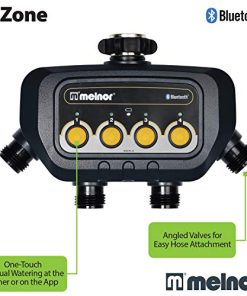 4 high flow valves to water multiple areas | Easy and convenient scheduling from your smart device through the app within a range of 30 ft. | The angled valve design makes it easy to attach multiple hoses | Flexible watering options ?C water on specific days of the week or on a schedule of every few days. Each valve works like a separate timer with up to 12 customizable start times per day | Turn on Manual Mode from the valve unit or through the app to easily access the faucet whenever you need it | Watering Delay temporarily pauses the schedule due to rain or when the ground is already wet | Create unique device zone names and secure your timer with a password | Minimum requirements: iOS 9 or Android 7.0£¬ Bluetooth 4.0 | Bundle includes 1 Melnor 4-Zone Bluetooth Water Timer and 5 extra filter washers | Backed by a Melnor 7-Year Limited Warranty. Melnor stands behind its products.