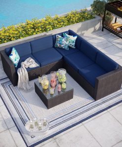 MF Studio 6 Piece Patio Sofa Set Outdoor Furniture Sectional All-Weather Wicker Rattan Sofa Navy Blue