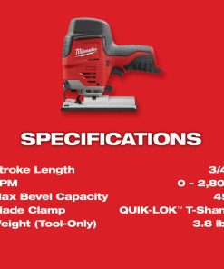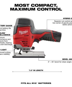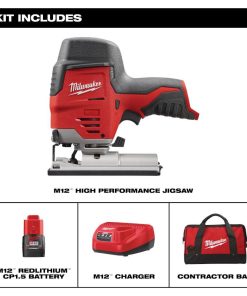 The MILWAUKEE? M12? Cordless High Performance Jig Saw is the most compact£¬ lightest weight professional cordless jig saw on the market with its innovative Hybrid Grip? design for greater control. The jig saw handle design provides superior cut control and a low center of gravity for precision during curved cutting applications. A powerful ?” stroke length and 0-2£¬800 SPM variable speed trigger deliver fast and accurate cuts in multiple materials. The Jig Saw features a QUIK-LOK? T-Shank blade clamp and tool free 450 bevel capability for quick and easy tool adjustments. The Milwaukee Cordless Jig Saw is uses an M12? REDLITHIUM? battery and has a built-in LED light to highlight the cutting surface for improved visibility. The M12? Jig Saw is designed to minimize vibration by positioning the tool weight directly over the cutting area. The jig saw is ideal for making quick cuts in wood£¬ metal£¬ wall tile£¬ or plastics without the hassle of pulling out a cord. This kit includes (1) M12? RED LITHIUM? compact battery£¬ 30-minute charger£¬ (1) 10 TPI wood cutting blade£¬ anti-splintering insert£¬ non-marring shoe£¬ and contractor bag.
