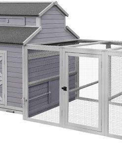 This Morgete chicken coop comfortably houses up to 10 chickens and features an extended roosting bar which providing more space for chickens. Galvanized wire walls and a series of locks on each access point keep your household animals safe inside. House comes with two removable sliding trays for easy cleaning and metal wire fencing for ventilation. Our deluxe chicken cage equip a built-in nesting box that divides into three rooms to storage eggs. OVERALL DIMENSIONS: 115.1″(L) x 54.0″(W) x 56.0″(H)