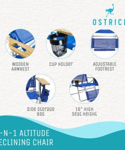 The Altitude 3N1 Chair is a direct descendant of the ever-popular Ostrich 3N1 Chair. The Altitude provides the same great features as the regular 3N1£¬ but sits a lofty 16 inches off the ground. It also includes a convenient side storage bag. Treat yourself to this luxurious chair and experience the ultimate in comfort and versatility with its 5 adjustable chair positions£¬ a longer adjustable foot-rest£¬ and extra-wide wooden arm rests. For extra convenience£¬ this chair includes a cup-holder that can carry big drinks£¬ a side storage bag to carry all your personal belongings£¬ and a carry strap to easily carry your chair with ease at the end of the day. Made from heavy Duty textiline on an aluminum frame£¬ this chair will last you many years to come. Get ready to enjoy your day and relax with the 3N1 Altitude Outdoor Lounge Chair by Ostrich.
