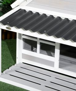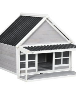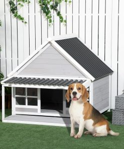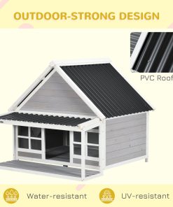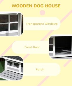 PawHut Wooden Dog House Outdoor with Porch, Cabin Style Raised Dog Shelter with PVC Roof, Front Door, Windows, for Large Medium Sized Dog