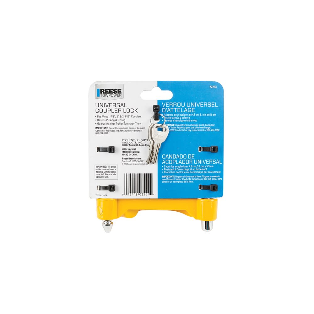 This Reese towpower universal coupler lock prevents theft and keeps your trailer secure. The bright£¬ yellow color is highly visible and deters thieves. It features a ratchet design with six locking positions for versatility£¬ and is designed to fit 1-7/8 In.£¬ 2 In.£¬ and 2-5/16 In. couplers.