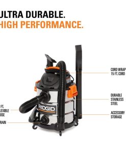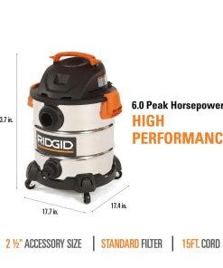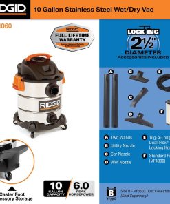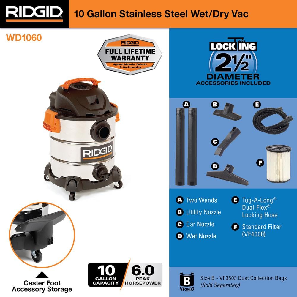 Ridgid 10 Gallon 6.0 Peak HP Stainless Steel Wet/Dry Shop Vacuum with Filter, Locking Hose and Accessories WD1060
