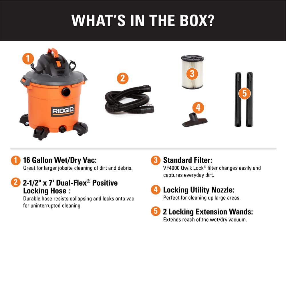 Ridgid 16 Gallon 5.0 Peak HP NXT Wet/Dry Shop Vacuum with Filter, Locking Hose and Accessories HD1640