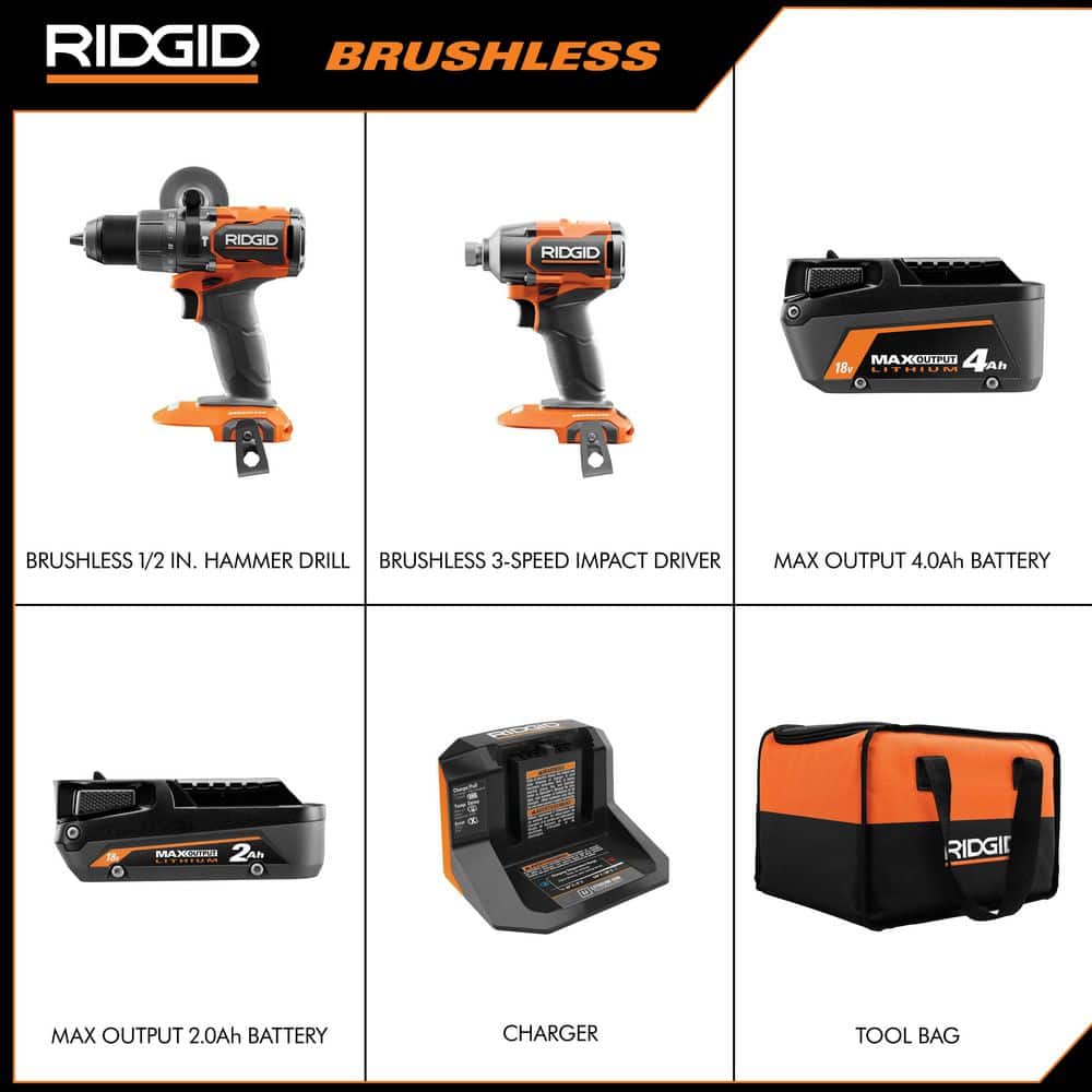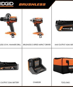 Includes: Includes: (1) R86115 Brushless 1/2 in. Hammer Drill/Driver, (1) R862311 Brushless 3-Speed 1/4 in. Impact Driver, (1) R840020 2.0 Ah MAX Output Battery, (1) R840040 4.0 Ah MAX Output Battery, (1) R86093 Charger, and Tool Bag