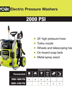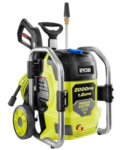 The RYOBI 2000 psi 1.2 GPM Electric Pressure Washer is powerful and compact£¬ making it perfect to use around the home. This pressure washer features a durable metal roll cage frame£¬ wheels and a telescoping handle allowing for easy transport. The 13 Amp electric motor delivers 2000 psi of force for cleaning of driveways£¬ decks£¬ windows£¬ boats£¬ campers and other areas around the house. A powerful turbo nozzle£¬ 15 nozzle and soap nozzle are all stored on the unit for user convenience. An on-board detergent tank offers easy soap application and the 25 ft. non-marring hose allows you to access even more area. The RYOBI 2000 psi Electric Pressure Washer is backed by a 3-year warranty.