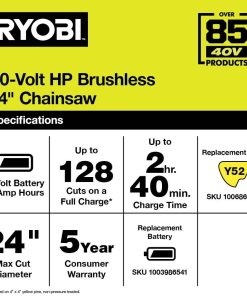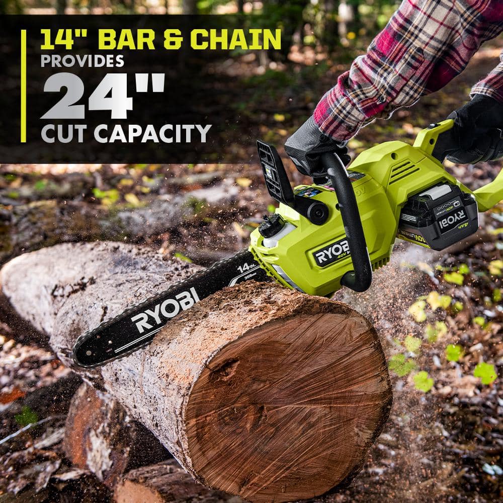 If you’ve wondered whether a cordless chainsaw could perform as well as gas£¬ Ryobi has your answer. The 40V 14 HP Cordless Chainsaw includes features to make your cutting experiences more efficient than a gas unit£¬ with the convenience of battery powered operation. With the pull of a trigger£¬ the 40V HP technology paired with a brushless motor delivers 15% more power£¬ along with longer runtime and motor life. With a 24 cut capacity£¬ adjustable automatic oiler£¬ side access chain tensioning£¬ and on-board tool storage£¬ you’ll experience easy£¬ comfortable operation for any clearing jobs. As part of the Ryobi 40V system£¬ it is compatible with all 40V batteries. Best of all£¬ the Ryobi 40V 14 HP Cordless Chainsaw is backed by 5-year warranty.