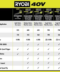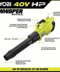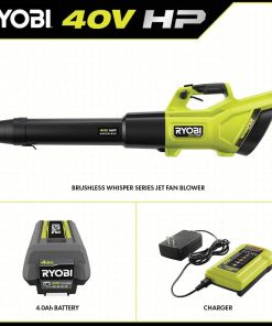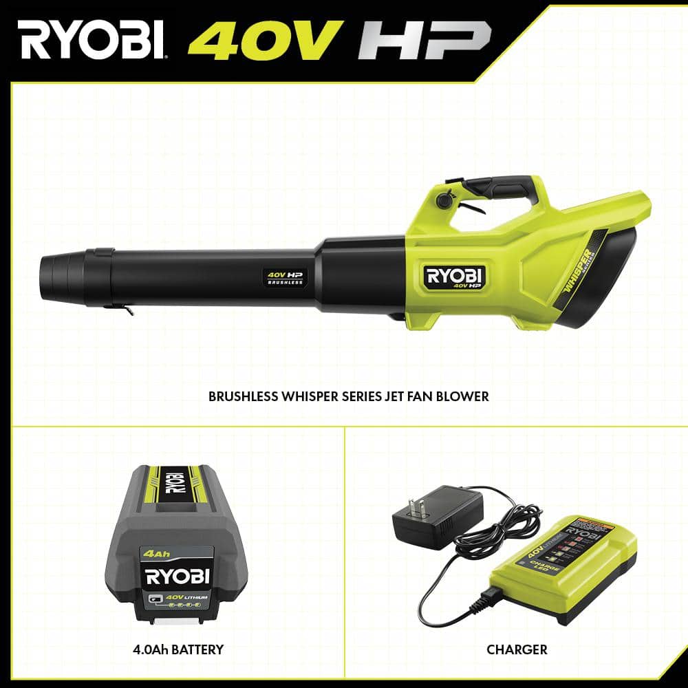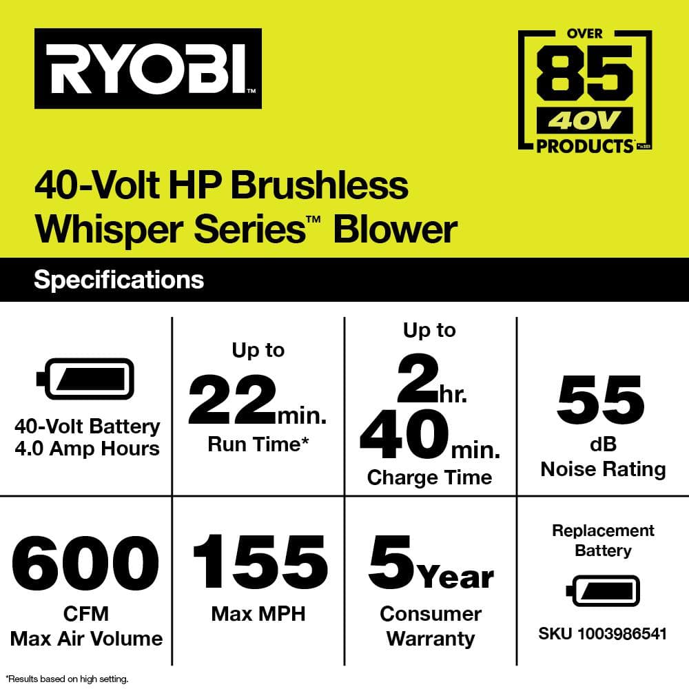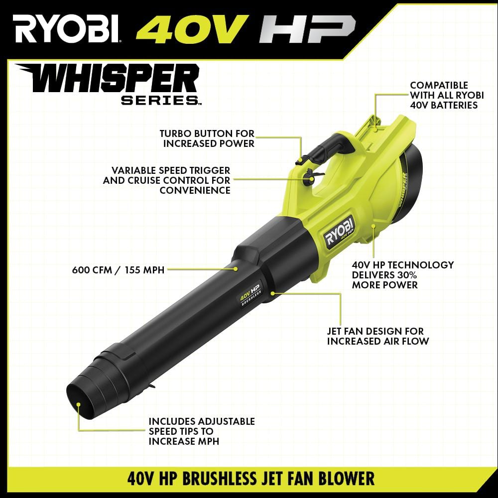 RYOBI 40V HP Brushless Whisper Series 155 MPH 600 CFM Cordless Battery Leaf Blower with 4.0 Ah Battery and Charger RY404130