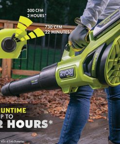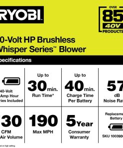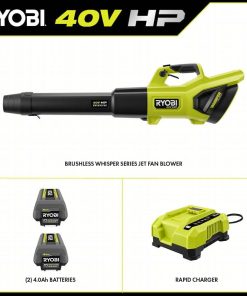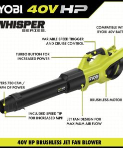 Introducing the Industry’s most powerful cordless handheld blower! The RYOBI 40V HP Brushless Cordless Jet Fan Blower is an incredibly powerful outdoor tool that can tackle the toughest jobs. The intelligent brushless motor delivers maximum power for added performance and a longer motor life. The jet fan design delivers an impressive 730 CFM of clearing power to easily blow through the toughest cleanups. At only 57 dB£¬ this Whisper Series blower is so quiet you can complete yardwork no matter the time of day. The included two 4.0 Ah batteries you get extended runtime. This blower features a turbo button and variable speed trigger that allows you to control the output of air. Gently clear light debris like dry leaves from delicate areas on low£¬ clear large volumes of leaves on high£¬ and when maximum power is needed£¬ use the turbo button to blast away stubborn debris like wet leaves. For even more versatility£¬ use the included speed tip to deliver 190 MPH allowing users to quickly clear areas. For convenience£¬ this blower features cruise control£¬ allowing you to blow through yard cleanup without having to hold down the trigger. The included 40V rapid charger£¬ charges your RYOBI 40V batteries 4X faster than the standard charger£¬ charging (1) 40V 4.0 Ah battery within 40 minutes. The RYOBI 40 HP Brushless Jet Fan Blower£¬ the 2 included 4.0 Ah batteries£¬ and the rapid charger are all compatible with over 85 RYOBI 40V products. This blower is backed by a 5-year warranty.