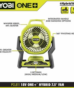 RYOBI introduces the 18V ONE+ Cordless Hybrid WHISPER SERIES 7-1/2 in. Fan Kit with 2.0 Ah Battery and Charger. Now part of our WHISPER SERIES£¬ this fan is 44% quieter with 24% greater air velocity to keep you cool no matter the application. Equipped with 3 speed settings and a 160 degree pivoting head£¬ the airflow can be customized to direct the air where itFTs needed. Our new compact design features an integrated handle and multiple hanging options for maximum portability£¬ use£¬ and storage. The included battery and charger are compatible with all RYOBI 18V ONE+ Tools. Best of all£¬ it is part of the RYOBI ONE+ System of over 280 Cordless Products that all work on the same battery platform. This 18V ONE+ Hybrid WHISPER SERIES 7-1/2 in. Fan is backed by the RYOBI 3-Year ManufacturerFTs Warranty and includes (1) PCL811 18V ONE+ Hybrid WHISPER SERIES 7-1/2 in. Fan£¬ (1) PBP006 2.0 Ah Battery£¬ (1) PCG002 18V Charger£¬ and (1) Operator’s Manual.