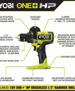 Enter your RYOBI 18V ONE+ System with the RYOBI 18V ONE+ HP Brushless 1/2 in. Hammer Drill Kit. ONE+ HP Technology delivers more power£¬ runtime£¬ durability and speed utilizing brushless motors£¬ advanced electronics and high performance lithium technology. This hammer drill features up to 29% faster drilling in hammer mode£¬ saving time per drilling application. Its impressive 0 – 31£¬00 BPMs and 750 in./lbs. of torque maximizes power to drill through concrete£¬ brick and block with ease. Integral features include a two-speed gearbox (0-500 and 0-2£¬100 RPM) and a 24-position clutch with hammer mode for full control while drilling and driving. This hammer drill features a ratcheting metal chuck for increased durability and accessory retention during heavy duty applications. Best of all£¬ it is part of the RYOBI ONE+ System of over 280 Cordless Products that all work on the same battery platform. This 18V ONE+ HP Brushless 1/2 in. Hammer Drill Kit is backed by the RYOBI 3-Year Manufacturer’s Warranty and includes (1) PBLHM101B 18V ONE+ HP Brushless 1/2 in. Hammer Drill£¬ (2) PBP003 18V 2.0 Ah Lithium HIGH PERFORMANCE Battery£¬ Charger£¬ Tool Bag£¬ Auxiliary Hander and Operator’s Manuals.