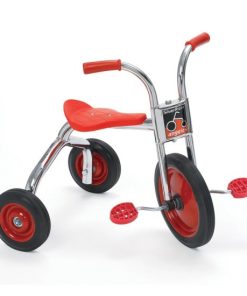 the angeles silverrider 12 in. trike is perfect for little riders. the seat measures 15.75 in. h, the front wheel measures 12 in. diameter, and the handlebars measure 24.75 in. h. all silverrider trikes feature durable plating and a welded steel frame with primary red accents. the solid rubber tires are long-lasting and contain self-lubricating nylon bearings. silverriders support children up to 70 lbs. the recessed hub is ed for safety. replacement parts available. 28 x 22 x 25 in. recommended for ages 3-5. 5-year guarantee.