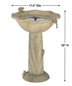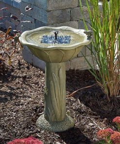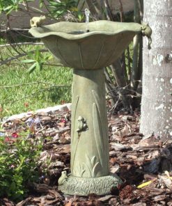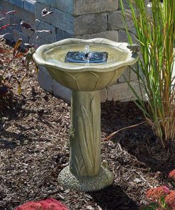 This whimsical solar birdbath in an olive green finish features our patented integrated solar system so there are no wires to install. All the unit requires is water and direct sunlight. Simply place in a sunny area of the garden to create an eye catching watering hole for the birds. Recycles water through hidden reservoir. Includes built in bubbler or use the 360-Degree spray head.