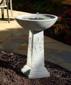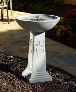 The Gingko Solar Birdbath creates a soothing and relaxing atmosphere on your patio£¬ deck£¬ balcony or in your garden. It comes in an elegant weathered stone finish and features gingko leaves stamped around the middle base of the birdbath. 2-fountain heads are included£¬ allowing you to switch between a bubbling and umbrella spray feature.