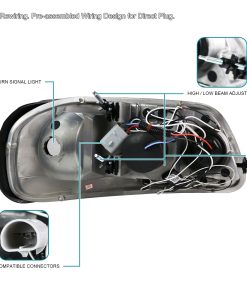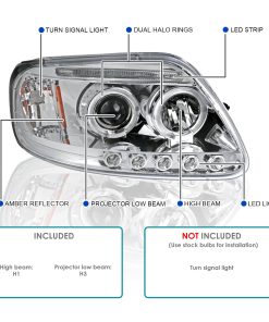 Brand new in original packaging. Exactly the same as shown in the picture! Comes with both headlights. H1 light bulbs included for HIGH/LOW beam. High quality clear projector headlights w/ dual halo rings & LED lights. These lights are made by an OE approved and ISO certified manufacturer with the quality meet or exceed all OE standards. Doesnt come with installation instructions. Professional installation is recommended.