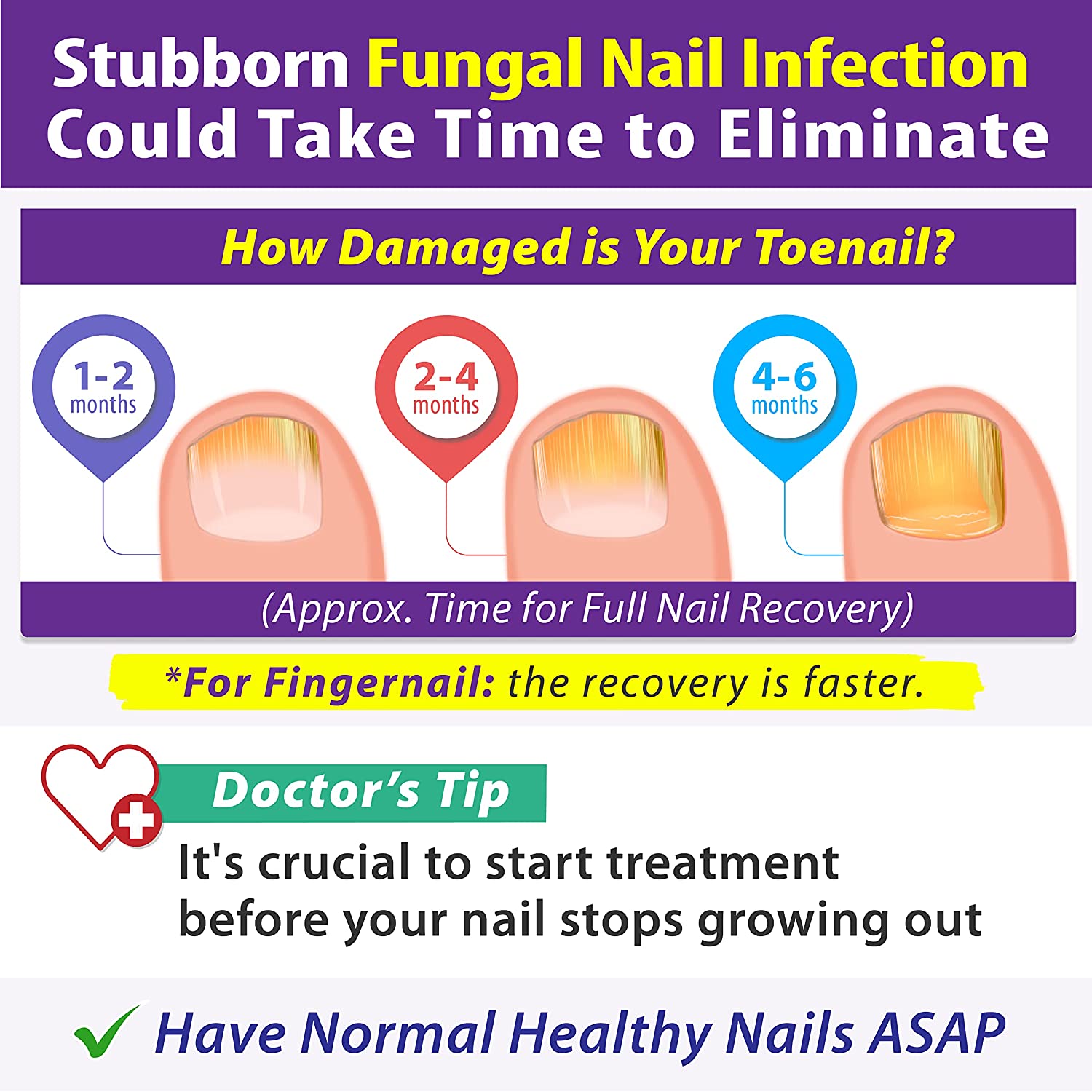 - Doctors Tip: Stubborn fungal nail infections could take time to eliminate. ItFTs crucial to start a nail fungus treatment for fingernail and toenail before the healthy nail stops growing out. So that you can have normal looking nails again