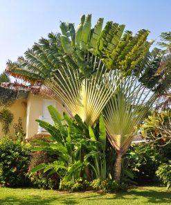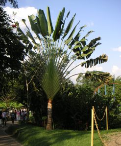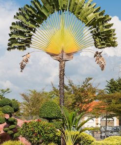 Grown£¬ packaged and shipped exclusively by Wekiva Foliage. Ravenala madagascariensis£¬ commonly called traveller’s tree or traveller’s palm£¬ is a large tree-like plant which is native to moist forests in Madagascar where it will grow over time to 30-50′ tall. It has now been planted in frost free areas around the world£¬ including far southern Florida into the Keys£¬ southern Texas£¬ southern California and Hawaii. This plant features an unbranched trunk (to 12″ diameter) which is topped by a fan-shaped single plane of enormous£¬ long-stalked£¬ banana-like£¬ deep green leaves (20-30 per trunk). Each leaf blade is 5-10′ long by 2-3′ wide and appears at the end of a thick£¬ grooved leaf stalk (petiole) which is as long or longer than the leaf blade. Leaf margins are sometimes split as is the case with some bananas. Up to one quart of rain water will accumulate in the expanded and cupped base of each leaf stalk£¬ thus giving rise to the common names for this plant which suggests an emergency drinking water source for travellers in need. Showy 3-petaled white flowers in cymes rise from boat-shaped spathes in a manner reminiscent of this plant’s bird-of-paradise (Strelitzia) relative. Flowers bloom in summer plus sporadically throughout the rest of the year. In early years£¬ the trunk of this plant is subterranean (not visible)£¬ with the fan of leaves sitting on the ground. Eventually the trunk does appear and lengthen£¬ with somewhat attractive leaf scar rings forming on the trunk surface as the lower leaves drop.